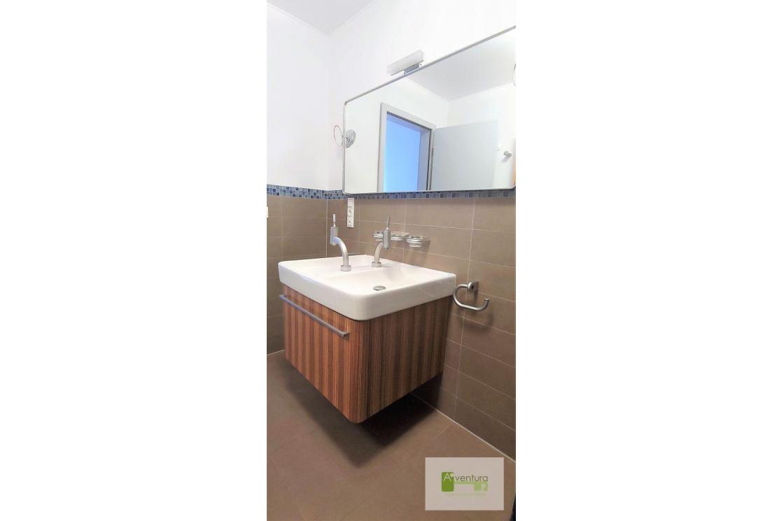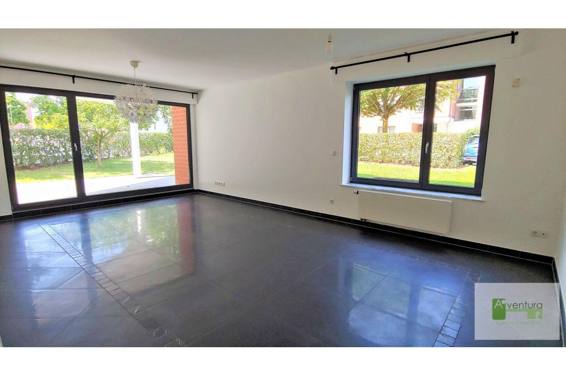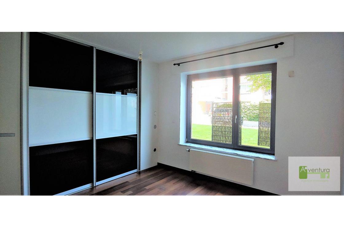 L' appartement se compose de deux chambres à coucher de respectivement 12 m² et 14 m², une salle de douche avec 2 vasques et un WC, un WC séparé, une cuisine fermée et équipée de 12 m² et un séjour de 27,5 m². Cuisine et séjour s'ouvrent sur la terrasse et le jardin. Le vaste hall d'entrée permet d'accueillir un coin bureau.