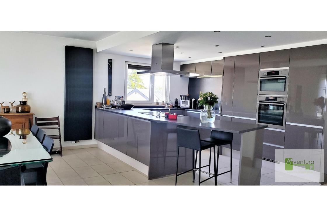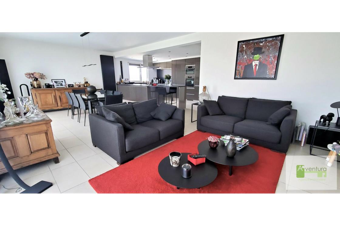 Le hall d'entrée, avec vestiaire et WC, débouche sur une vaste et lumineuse pièce de vie de 50 m² qui accueille le salon autour d'une cheminée à l'éthanol, la salle à manger et une belle cuisine entièrement équipée.