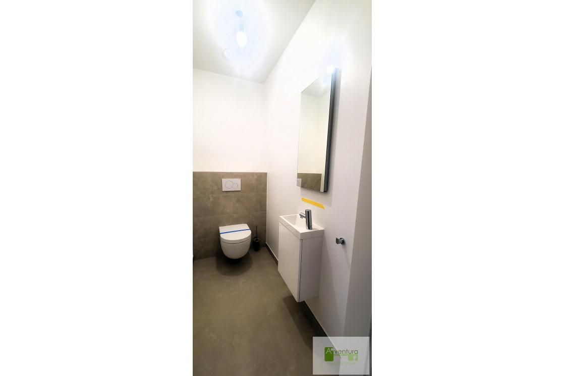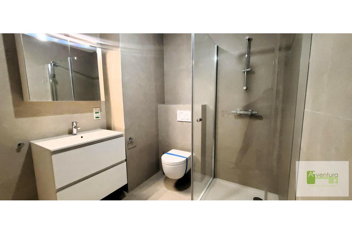 - Une salle de bain avec douche, lavabo, WC, porte serviette chauffant.Branchement prévu pour machine à laver le linge.