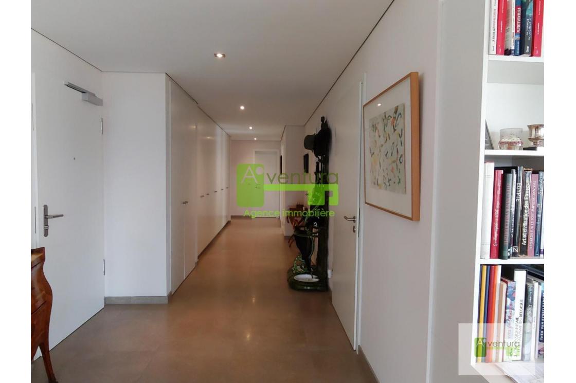 D'une surface de 183 m², l'appartement s'ouvre sur un hall d'entrée avec placards encastrés et toilettes séparées et se prolonge ensuite vers un immense séjour de 70 m² encadré de deux terrasses et un balcon. Une cuisine haut de gamme (Leicht) jouxte le séjour.